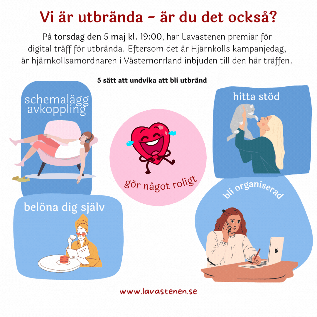 Välkommen att anmäla dig att deltaga på vår lilla föreläsning och digitala träff för utbrända som har premiär torsdagen den 5 maj kl. 19:00. Dessa träffar kommer inledningsvis hållas varannan torsdag för personer med egen erfarenhet av att vara utbränd.